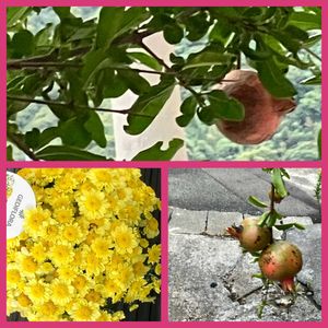 ◉ザクロ(実) ミソハギ科 落葉小高木 花期は初夏、果実は球状 果皮は硬く熟すと外皮が 裂け赤い果肉の粒が現れ ます ◉ベルギーマム 🌼 キク科 ベルギーの品種改良メー カーが開発した自然に まん丸な球形に育つ洋菊 ◎友達の所のザクロ 過ごしやすい1日でした