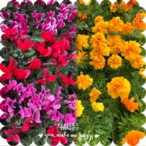 ◉シクラメン サクラソウ科 多年草 花色 白、赤、ピンク 黄、紫、複色 花の大きさにより 大輪系、中輪系、小輪系 花色や花形も様々です ガーデンシクラメンは 寒さに強く庭植えにも できます ◉マリーゴールド キク科 花色 黄、オレンジ、白 赤、複色 鮮やかな花色で長期間 次々と花を咲かせます 草丈が低く枝分かれの 多いフレンチと高性で 大輪のアフリカンが 主に栽培されます 細かい葉が茂り一重咲き 小輪多花性のメキシカン マリーゴールドもあり ます