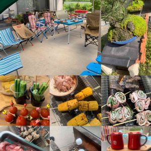 🔥🍖お庭でBBQ🍖🔥 カーポートの下にBBQの机と椅子ターフをセットしました♪ 右上⤴️BBQの台はホムセンで購入したU字溝.普段は瓦を2枚起き、盆栽を飾ってます🌿 真ん中左 BBQ始まってすぐに食べれるピンチョス🍅🧀🥒ときゅうりに一本漬を串にさします。 真ん中センター 焼きとうもろこし🌽とベーコンカマンベール🥓🧀です。 真ん中右→大葉を豚バラ肉で巻いて串に刺しました🐷🌿 左下↙️肩ロースは我が家はわさび醤油で頂きます🥩 下段真ん中 U字溝BBQはマシュマロ焼きもやり易いです✨✨ 下段右下↘️最後はお庭で珈琲タイム☕️ 今日は我が家と義両親と大叔母夫婦の家族のBBQ🍖🔥お天気持ち良かったです🌈 明日は息子の同期が9人も来る予定☔️土砂降りだろうがやるそうです( ・∇・)雨だけどねーBBQ🍖🔥やるんだー💦 U字溝BBQは片付けが楽なのて、秋刀魚などの長い魚や串焼きが大量に焼けるメリットがあります。映えませんがおすすめします🌿