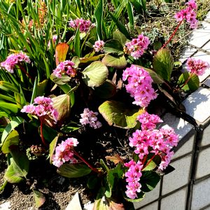 朝の散歩道 ご近所散歩 通り道のブティックの花壇に、 ヒマラヤユキノシタの花が、咲いていました。