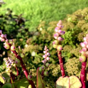 おはようございます♪ 🌱ツルムラサキ 散歩中にかわいい花🩷と思ったら ツルムラサキの花でした✨ アジア原産のつる植物 食用は主に緑茎種、赤茎種は鑑賞用 だそうです