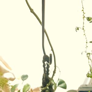 ハートホヤの最先端 蔓の大冒険ですが ハートホヤの真上に吊るされた ハンギング紐をみつけ 気に入って巻きついたようです。 こう来たか!思い付かなかった!