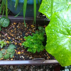💚可愛い葉っぱたち💚 雫をまとい、ツヤツヤ✨ 左 雪の下 中央 桔梗 右 ハッカク