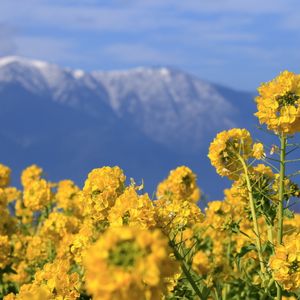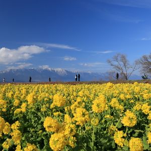 琵琶身のほとりの第1なぎさ公園。 1/2 カンザキハナナ(寒咲花菜)という名前の早咲きの菜の花が、面積約4,000㎡に約12,000本咲き、雪の残る比良山とのコントラストが楽しめます。