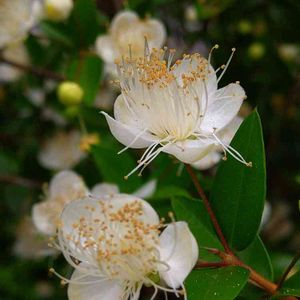 ギンバイカ 銀梅花 イワイノキ ヨーロッパでは結婚式の花輪にしたり 祝い事に使われるので 別名イワイノキ 花と葉に香りがあるそうな 嗅いでみないから わからなかったぁ~ でも蕊が‼️ 蕊好きはヤッホーです😆😆😆