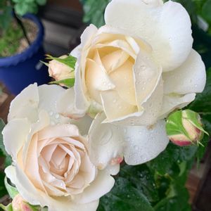パブロワ 咲き始めました♪ フワフワした白バラです♪ 今日は大雨😭 まだ半分くらいしか 咲いてないのよぉ まさか台風🌀🌀 こっちに来ないわよねぇ まだ秋までご勘弁を😢
