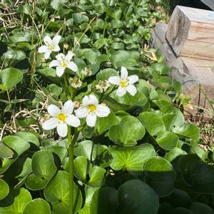 イワイチョウ(岩銀杏) ミツガシワ科 葉の形がイチョウに似ていて秋になれば ちゃんと黄色い葉になるそうです。 毎年山でイワイチョウを見てますが、自生地は岩よりも 水のある湿地帯の方が多いです。 なので別名のミズイチョウ(水銀杏)に納得🤗 苗場山高層湿原の木道で