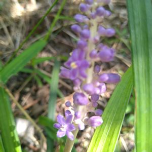 藪蘭(ヤブラン) キジカクシ科ヤブラン属の多年草。山野の木陰に生える。葉は束になって根生し、常緑で1年中青々としている。花期は8~10月。葉の間から高さ30~50㎝の花茎をだし、淡紫色の小さな花が数個ずつ固まって房状につく。花被片は長さ約4㎜。花後につく球形の果実は果皮が薄く未熟なうちに乾いて落ち、種子がむき出しになって生長するため、代わりに種子の皮が厚くなる。種子は緑色球からやがて光沢のある黒色になる。果実のようにみえるが種子で、種子がむき出しになって成熟するのはヤブラン属とジャノヒゲ属の特徴。 葉の感じから名前に蘭と付くがランの仲間ではない。葉がラン科の春蘭(シュンラン💬春に雑木林で咲くラン)に似ていて、薮に生えるのが名前の由来。 出典『都会の草花図鑑』『散歩の草花図鑑』『野に咲く花』