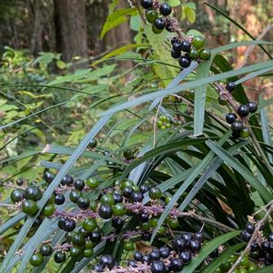 秋には直径約5mmほどの 球形の種子を露出して付け 光沢があって まるで果実の ように見え 熟すと緑色から 黒紫色に変わります🟢🟣⚫️ ✳️この果実は皮が早く落ちて 種子がむき出しになります✳️ 薮蘭(やぶらん) キジカクシ科