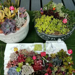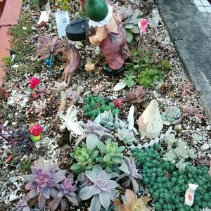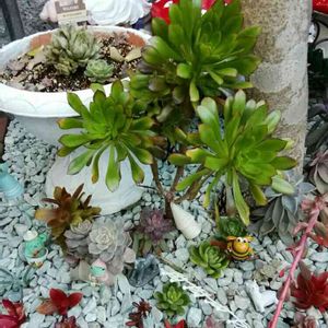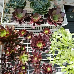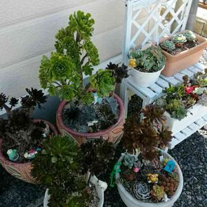 こんばんは~o(^▽^)o⁝⁝⸃₍⁽΄˙̥΄ ⁾₎⸜☂ 鉢減らしにアエオニウム丼にしてみたょ~🤣 鉢カバーだったのに、センターポンチで穴開けて鉢にしたんですよ☺️ みんなで1つの鉢に入って嬉しいかな(笑)