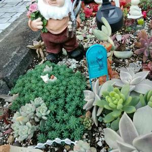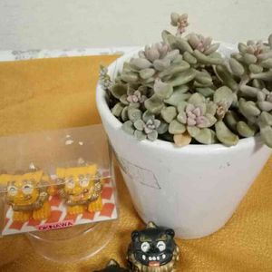 GW中に黒法師だけ集めてミセバヤと一緒に寄せ植え、鉢も色塗り〜思い切り明るくしてみました、そしてお土産に頂いたシーサーをちょこんと置いたら可愛いじゃん💕
