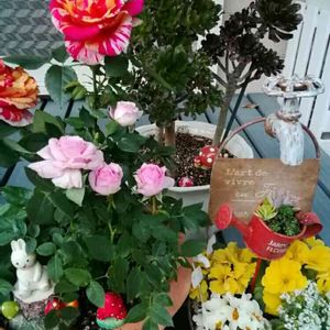 こんばんは😃🌃 🌹バラを🌹1つの鉢にまとめて🌼お花も1つの鉢に🌼 さっと😁入れ込んだ😁だけですゥ~(⌒‐⌒)🍄 🌼お花はメール会員様のプレゼント❗🌹バラも購入しました (松フラさん✨にて) 7鉢が💕なんと❗(⌒‐⌒)2つに✨減らしましたぁ~💕