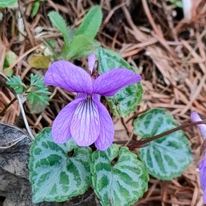フイリミヤマスミレ 🌱スミレ科 スミレ属 ✽地上茎のないスミレで高さ3〜10cm ✽葉は心形で縁は波状の鋸歯となり、先が摘んだようにとがる ✽花は側弁2個の基部に毛はなく、距は円筒形 ✽葉の表面葉脈に沿って白い斑が入る 割と良く見かけるスミレ💜