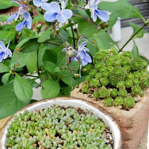 タニ友ちゃんから届いた可愛い子🍀 (ღ˘ㅂ˘ღ)♡︎ʾʾウフ ↖️モンテナス・ブラキカウロン 小ちゃな子だけど葉がぽってりしていて可愛い💕 これからランナーも出てくるみたい… 楽しみ〜❣️ ↗️プラティフィラ 雨晒しでも元気な子みたい… 群生にしてみたいなぁ😊 ↔️ロスラリア・セドイデス ランナーがたくさんピョンピョン めちゃくちゃキュート(pq′∀︎`*)💕 今年は長〜〜〜い夏になりそうだから夏越しが心配だけどみんな元気に育ってくれますように゚・*:.。*( ˘͈ ᵕ ˘͈ )・*:.。 タニともちゃん、どうもありがとう❣