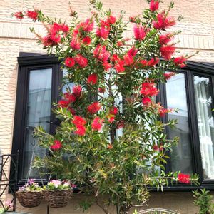 わが家のシンボルツリー ブラシの木は上の方がら順番に咲いて行きます。高い位置にあるのは既に散り、新芽がその上に又出来るのです💓 下の方が今ちょうど満開です。ちょっと混み合ってるのですいてあげないといけないかなぁ⁇