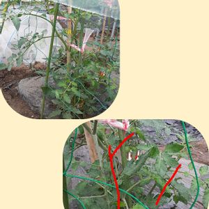 坂本さんのトマトジャングルですが、、 芽かきするか?迷っている間に梅雨入りとなってしまいました☔ 実は昨年 芽かきのタイミングや本数によると思うような原因で、 大玉2本ダメにした感じがするので、 雨のときの芽かきあまりしたくないなぁと思っている間に、 枝がビニルハウス、ネットを飛び出してきました。 坂本さんのトマトは、上部はこまめに芽かきできそうですが、 下方はジャングルのまま 一房だけ実らせてストップかけようと思います。 下方がおもいのほか育ってしまい、 太い枝にもう、蕾までついていたので、 なるだけならせてこの先は欠いていく! ことにします。 できるだけ晴れた日を逃さないようにしないとです。 自分は二本仕立てにしたつもりだったのに、いつのまにやら4本になってましたよ(≧ω≦。)