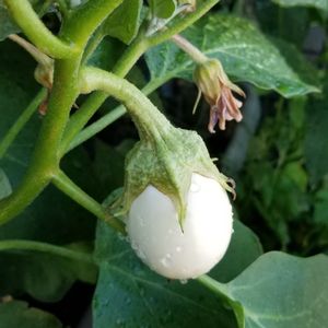 白なす💚 地方の園芸店で偶然見つけた白ナスの苗、今年はじめて育ててみました🔰 最初の実は葉っぱの影で見落としてビックになってしまったけど、焼いて食べたらトロトロでチョーおいしかった。❣🎵 なかなか実がつかなかったけど、ただいま2つ😊 楽しみ~🎵🎵