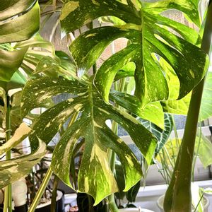 今日のナイトジャングル😊モンステラタイコンステレーション😊大好きです〜😊今日も1日おつかれさまでした。おやすみなさい💤🌙😘 斑入りモンステラ(バリエガータ)の主な人気品種をご紹介します。 🌿 白い斑(白斑)が入る系統 この系統は、深い緑と純白のコントラストが非常に美しいのが特徴ですが、白い部分は光合成能力が低いため、通常の緑葉のものよりデリケートな管理が必要です。 • ボルシギアナ・アルボ・バリエガータ(通称:ホワイトタイガー) • 特徴:深い緑の葉に、ペンキを散らしたような純白の斑が不規則に入ります。 • 分類:ボルシギアナ系のため、茎は細く、つる性の性質が強い傾向があります。 • 注意点:斑の入り方が不安定になりやすく、育成難易度はやや高めです。 • デリシオーサ・アルボ • 特徴:デリシオーサ(太い幹、大きな葉)の変異種で、純白の斑が入ります。 • 分類:ボルシギアナ系よりも葉が大きく、より肉厚な傾向があります。 • ホワイトモンスター(テンシンラン) • 特徴:広範囲にわたり白やクリーム色の斑が強く入り、時には葉全体がほぼ真っ白になる部分が現れることもあります。 🌟 黄色・クリーム色の斑(黄斑・散斑)が入る系統 この系統は、黄色やクリーム色の斑が入り、白斑の品種と比べて斑が安定しやすい傾向があります。 • タイコンステレーション(通称:タイコン) • 特徴:葉全体にクリーム色や黄みがかった斑が、まるで星を散りばめたように細かく入ります。 • 流通:タイで組織培養により作出された品種で、斑が安定しているため非常に人気があります。 • 分類:デリシオーサ系の特徴を持つことが多いです。 • デリシオーサ・オーレア(通称:イエローモンスター) • 特徴:鮮やかな黄金色や黄色の斑が、大理石のようなマーブル模様を描き出すのが特徴です。 • イエローマリリン • 特徴:濃い緑の葉に、明るい黄色やクリーム色の不規則な斑が入り、鮮やかなコントラストを楽しめます。 斑入りのモンステラは、どの品種も通常のモンステラよりも葉焼けしやすく、また**暗すぎると斑が消える(先祖返り)**ことがあるため、管理には特に注意が必要です。
