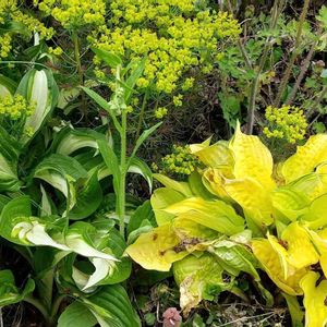 おはようございます🎶 旦那からの写メからです。 パラダイスアイランドが黄金葉を広げて緑に映えて良い感じ〜🎶左ホスタは名無しです。