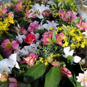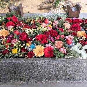 埼玉県上尾市のお寺での花手水です。 豪華で素敵な花手水です。