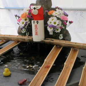 お出かけ先の神社 手水舎にコップに入って浮かんでいるキツネめんこいちゃね〜☺️