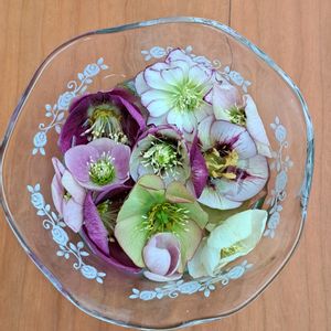 クリスマスローズでの花手水。こうすると花が良く見える。もっといい器も揃えないと。