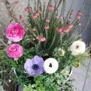 ファイアーヒースが大きく育ちました。アネモネやラナンキュラスはほぼ終わりですけどね😁 ビオラとアリッサム、ヒューケラ鉢はパンパン。