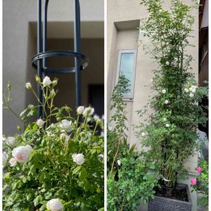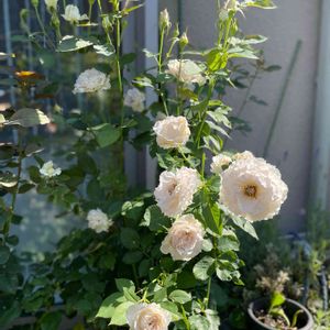 挿し木のアリエッタ グーンと背が伸びて蕾がいくつか咲き始めました パシュミナにも、クリスティアーナにも似た雰囲気で咲きはじめますが、大きくなった株は房咲きののびのびした枝でたわわに咲きます☺️ ツルなので早く大きく伸びます 娘のお庭に植えてあげようと計画中 お庭で可愛く咲いてくれるよ💓