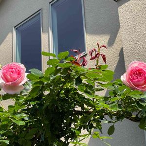 高いところでピエールさんが咲きはじめました💓 昨年グーンと伸びたシュートをアーチ状に誘引したら、簡単アーチの出来上がり😊 なかなか立派なお花が咲きました もう少し下にはこれから咲くツボミがたくさん出ています💕