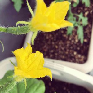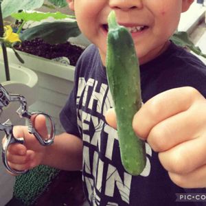 無事に第一号収穫🥒! 膨らみ損ねて何度か実が落ちてしまっていましたが、ようやく膨らみ始めました✨