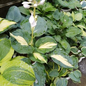 午後からの雨。 庭に出ることもできず。 軒先から斑の鮮やかなデカメなギボウシをパシャリ。