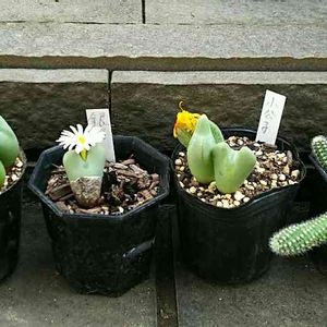 ニョロニョロ兄弟に新家族!花紋玉(囲まれてる四角白鉢) なかなか調べてもリトープスしか出てこなかったんですが、ベテランさんの?HPにて黄綺丸×白檀の子供とありました! 右下は確かダイソー柱サボテン。きっと従兄弟かハトコな感じなんでしょうね! 花が咲くのが楽しみたいです!