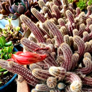 🧡紐サボテン 白檀🧡 🏷️木曜モフモフ 🏷️らんまん応援♪ 今日も☀️ギラギラーー あっついですねぇ🥵 紐サボテン… らんまんで和名が決まった瞬間は、笑っちゃいました ニョロニョロ長い紐サボテン のはずが、、、 ウチのはギューギュー💦 白檀はすーぐ子吹きしちゃうんですよね〜 植え替えるべきか…🤔 でも、冬寒さに当てて春には日向に出したのでお花が咲いてます 濃いオレンジ色のお花が妖艶ですねぇ チクチクな棘に見えますけど、ホワホワな優しい棘です 誰にでも育てられる簡単なサボテン🌵だと思います♡ 今日はバタバタなのでコメント欄閉じさせて下さいね