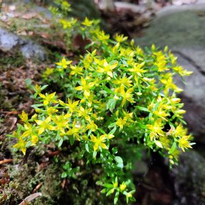 ヒメレンゲ(姫蓮華) 山地の湿った岩上に生えています😊 星形の黄色い5弁花を多数咲かせます😃 雄しべの葯が赤いのですが花も終盤なので黒くなっています😅