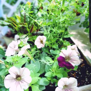 ペチュニア モンローウォーク ヴェールヴァルド 右の方のお花 不思議な花色で 咲いてます そういう品種 なのかな とっても素敵😊💜