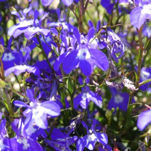 涼しそうなロベリアです。 和名では「瑠璃溝隠」(ルリミゾカクシ)、「瑠璃蝶草」(ルリチョウソウ)、「瑠璃蝶々(ルリチョウチョウ)」です。