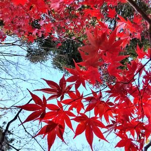 🏷️金曜キラキラ ノムラモミジ、真っ赤な紅葉🍁❤️❤️❤️ 木の下に入って光を通してみると、明るい赤色に変わってキラキラして見えました✨✨✨ 3枚目は、熟したカリンと一緒に💛❤️