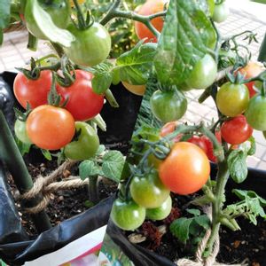 おはようございます。 ミニトマト🍅 苗も30㎝にみたない小さな苗にミニトマト🍅 初収穫8個採れました✌️🤗 表と裏の様子をです😃