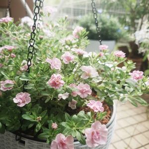寄せ植えその後③ ワイヤープランツが いい感じの垂れ具合に なってきました🌿 スポットライト感は無くなっちゃった けど好きな感じ😊 お花はカリブラコア アロハダブル🤙