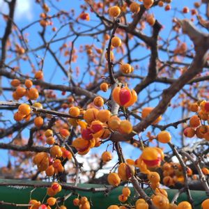 毎年見事な実を付けるご近所のツルウメモドキ🧡❤️🧡 青空に映えて凄く綺麗でした💙❤️🧡❤️💙✨