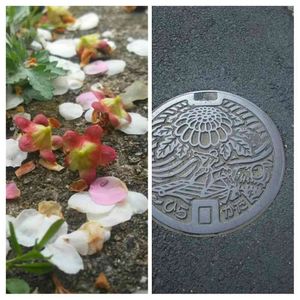 ヒマ、、いえ、待ち時間があったので お昼🍱買って来るね~💓と 街中散歩 下を向いて 歩いていると マンホールの意匠が 菊 枚方と言えば 枚方公園菊人形 小さい頃の家族レジャーの定番 もちろん 🌹バラ園もありましたけどね🎵 近くの梅林の 落花