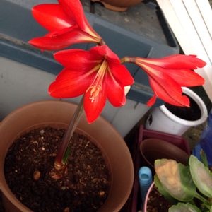 5月末に植え付けた アマリリス パークレッドが花開きました㊗️🙌 4鉢植えて、この子が1番乗り🎉