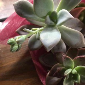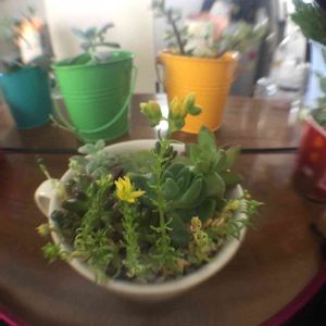 万年草が黄色くなって枯れてきたのかと思っていたら、花が咲きました。 娘に撮ってもらいました