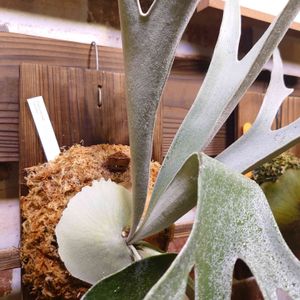 今日2枚めの投稿です 今日のお花 ビカクシダ シルバーリーフのものが欲しかったので ベイチーを選びました ほぼ一年になります シカの角のようになるのを期待してたんですが、それは別種類のようですね(๑˃̵ᴗ˂̵)