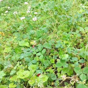 小雨でしたが綺麗だったので 駆け足で一枚💨 シロツメグサ🌱 マーガレット🌸 野いちご🍓