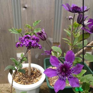 ヘリオトロープとクレマチス アフロボーイ。 アフロボーイは初めて育てましたが、思ってた丈より低く30〜40cm。もう少し伸びてくれないかなぁ。だけど、たくさん咲いてくれて嬉しかったです。花は個性的て色も素敵♡ ヘリオトロープはお店の目立たない場所に置かれて枯れそうになってたものです。「香水の花」とタグに書いてあって、それに惹かれてお出迎え。この花、今まで知りませんでした。もっと葉っぱを増やして大きくな〜れ!