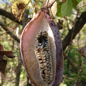 今日のお花 🫘アケビ🫘 アケビ科アケビ属ツル性落葉低木 和名「アケビ(木通、通草、山女)」 花言葉「才能」「唯一の恋」 アケビという和名の由来は、果実が熟してくると、肉厚の果皮が自然に裂け、割れ目から白い果肉と無数の黒い種子が覗く様子が、いかにも実を開けたように見えることから、「開け実」がなまってできたという説が有力です。 垣根にて 25.10.15 花は4月撮影