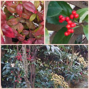 我が家の南天を集めてみました。 お多福南天 ヒイラギ南天 普通の(?)南天の紅白 難転祈願✨🔴 追記 右上はヒイラギ南天と思っていましたが自信ないのでタグをはずしました💦💦