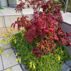 真っ赤に紅葉したおたふく南天。(*´ω`*) 花が少ない冬中、鮮やかな色で楽しませてくれました。(おたふく南天は、お正月より、少し過ぎて値下げされたものを買うのがオススメです。)