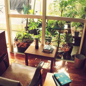 お気に入りの読書&植物スペース。最近はヤシ類が好きです。